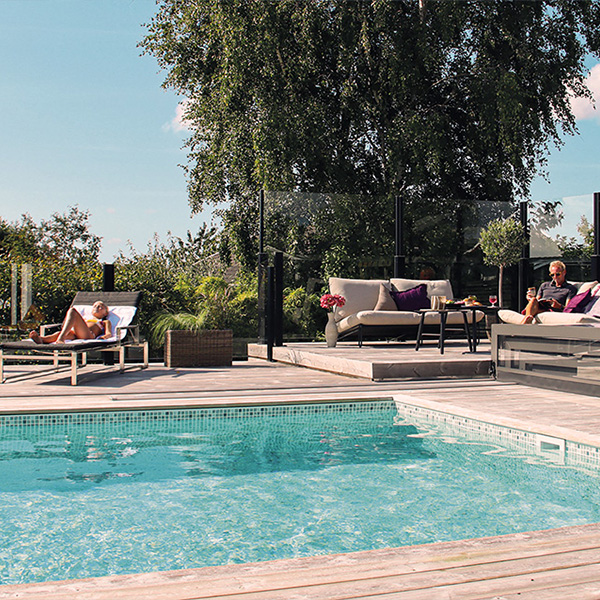 Glasräcke och vindskydd runt poolen